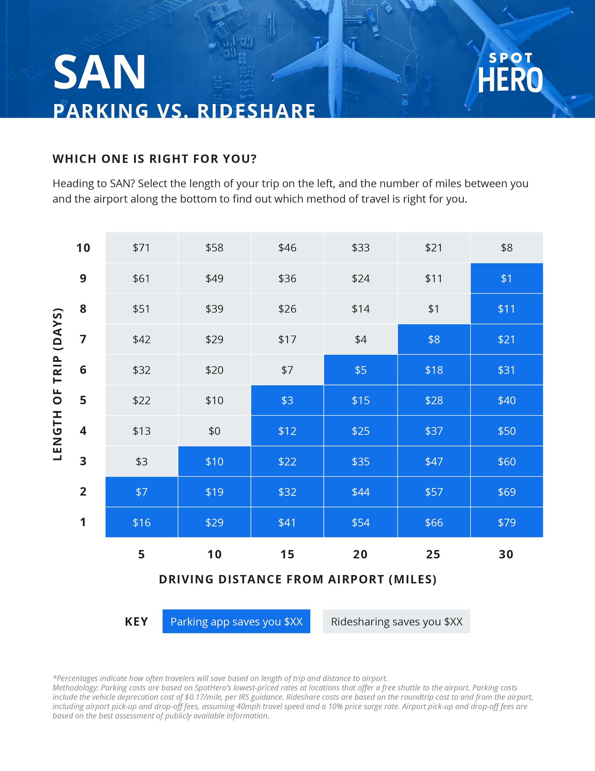 Start comparing your options by using our rideshare comparison chart. Compare the length of your trip and the driving distance to SAN to find the best money-saving option.