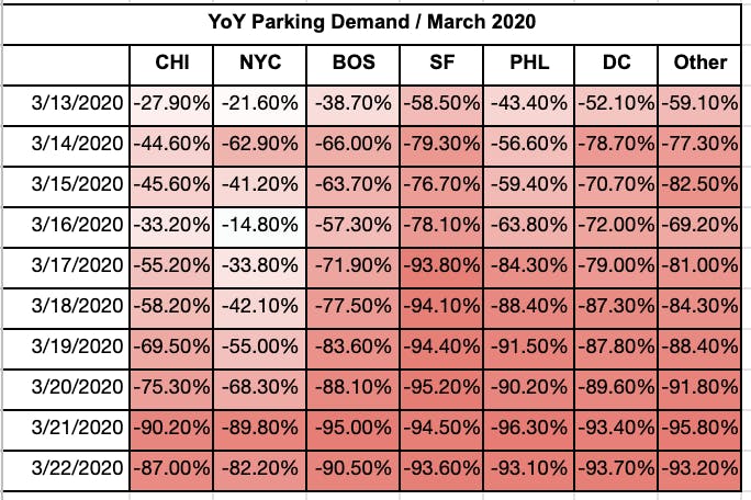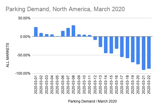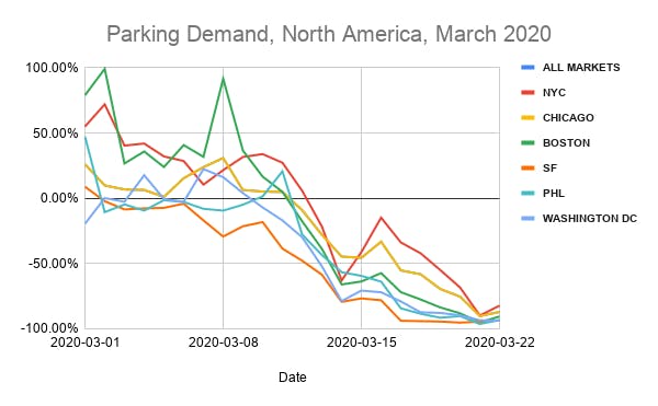 As the COVID-19 pandemic continues to wreak havoc on industries across the globe, SpotHero is closely monitoring the demand for parking across more than 7,500 partner locations in cities in North America. With up to 90% losses in parking volume, much like airlines and airports—the parking industry is devastated by a collapse in demand and job losses and furloughs for 50% of the industry’s workforce. Many are front-line hourly workers.